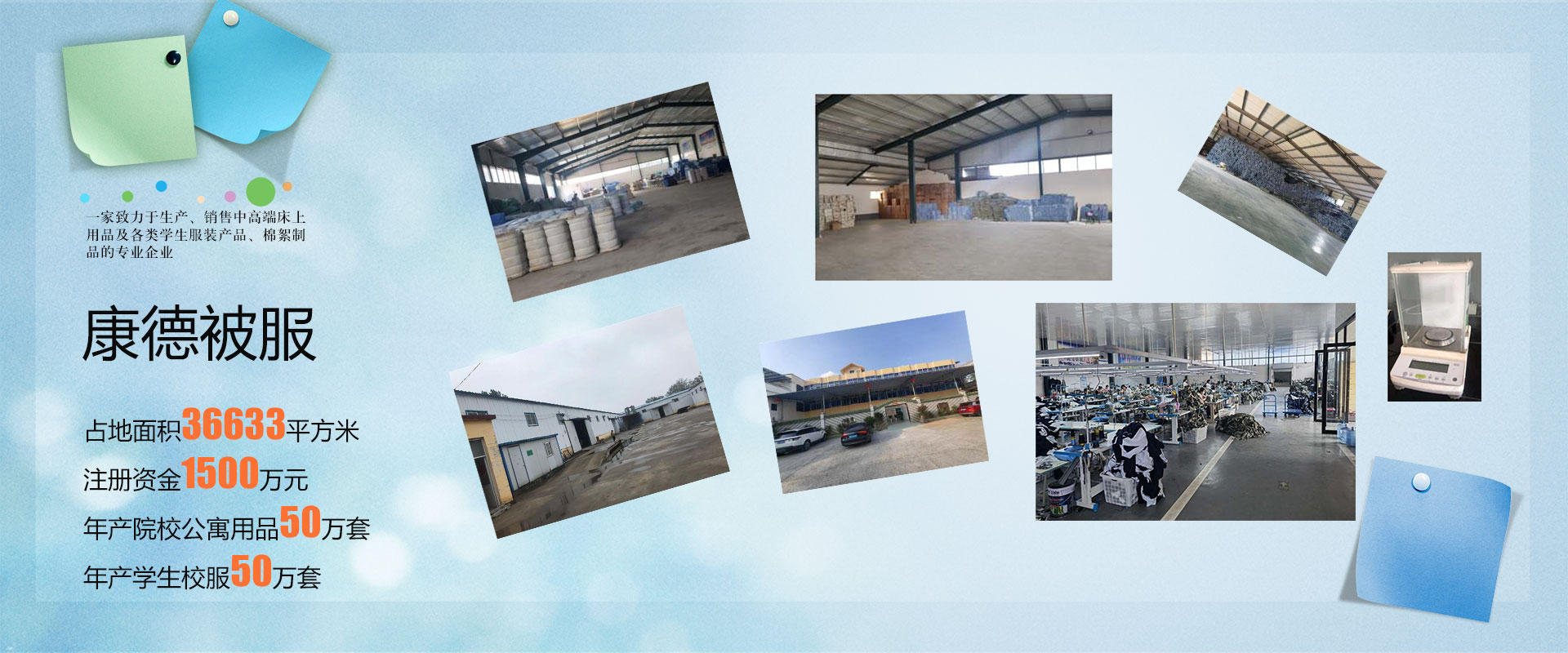 鄆城縣康德被服有限公司能根據各學校需求,為其提供棉被、床墊等學校床上用品,及校服定制、軍訓服定制等業務!